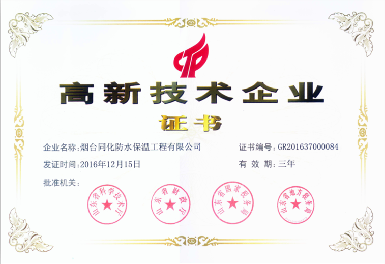 2009年起,煙臺(tái)同化防水保溫工程有限公司就通過了國(guó)家高新技術(shù)企業(yè)認(rèn)定,2016年底,根據(jù)國(guó)家《高新技術(shù)企業(yè)認(rèn)定管理辦法》和《高新技術(shù)企業(yè)認(rèn)定管理工作指引》的相關(guān)規(guī)定,我公司被認(rèn)定為國(guó)家高新技術(shù)企業(yè)。國(guó)家“高新技術(shù)企業(yè)證書”的再次獲得是對(duì)我公司產(chǎn)品技術(shù)所有權(quán)、技術(shù)創(chuàng)新能力、技術(shù)應(yīng)用領(lǐng)域等方面的認(rèn)可。
