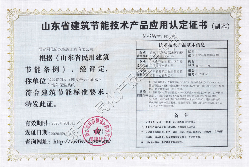 近日,煙臺同化防水保溫工程有限公司迎來喜訊,2020年09月,根據《山東省民用建筑節(jié)能條例》,經評定,公司保溫裝飾板(PU復合無機面板)外墻外墻保溫系統(tǒng)符合建筑節(jié)能標準要求,特發(fā)此證。