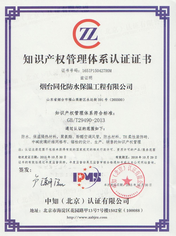 煙臺同化防水保溫工程有限公司,以其完整規(guī)范的知識產(chǎn)權(quán)管理流程及卓有成效的知識產(chǎn)權(quán)實(shí)施效益,通過《企業(yè)知識產(chǎn)權(quán)管理規(guī)范》(GB/T-29490)的國家標(biāo)準(zhǔn)認(rèn)證審核,成為煙臺福山區(qū)首家通過《企業(yè)知識產(chǎn)權(quán)管理規(guī)范》認(rèn)證的企業(yè)。